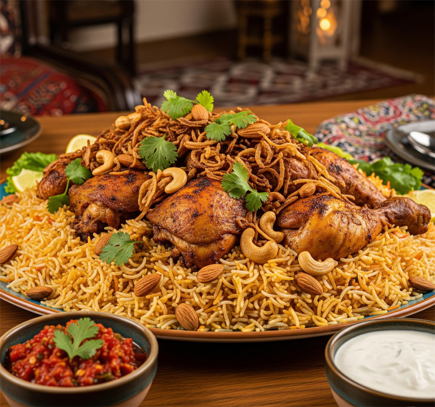 Fragrant basmati rice cooked with tender, spiced chicken, seasoned with traditional Arabic spices.