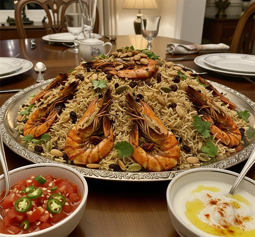 Succulent shrimp served over aromatic rice, infused with traditional spices for a unique flavor.